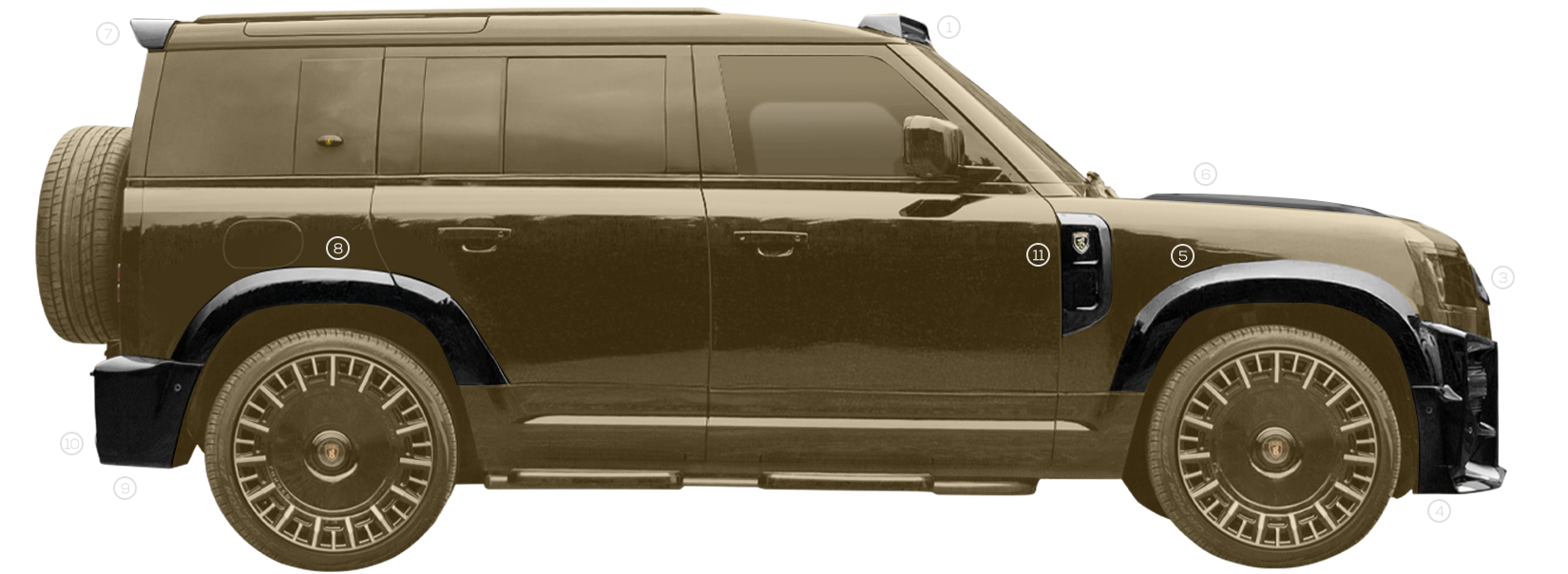 Inspired by the keen vision and precision of its namesake, FALCON elevates the Defender 110 with sharpened aerodynamics and assertive geometry. Its bold contours honour the Defender’s legacy while propelling it into a modern era of luxury performance.