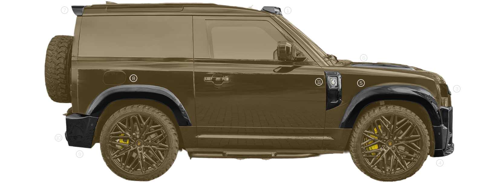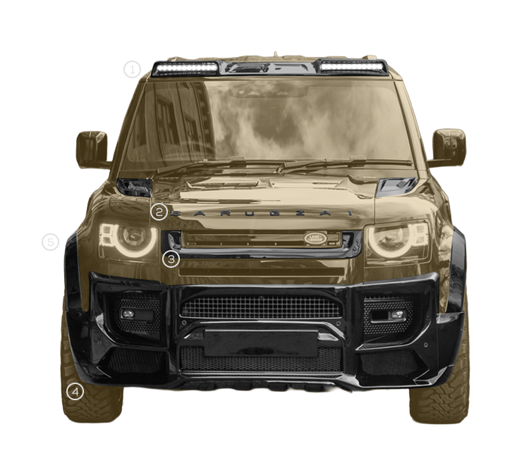 Inspired by the keen vision and precision of its namesake, FALCON transforms the Defender 90 with athletic aerodynamics and sharpened geometry. Tailored to the compact wheelbase, its bold contours honour the Defender’s legacy while propelling it into a modern era of luxury performance.